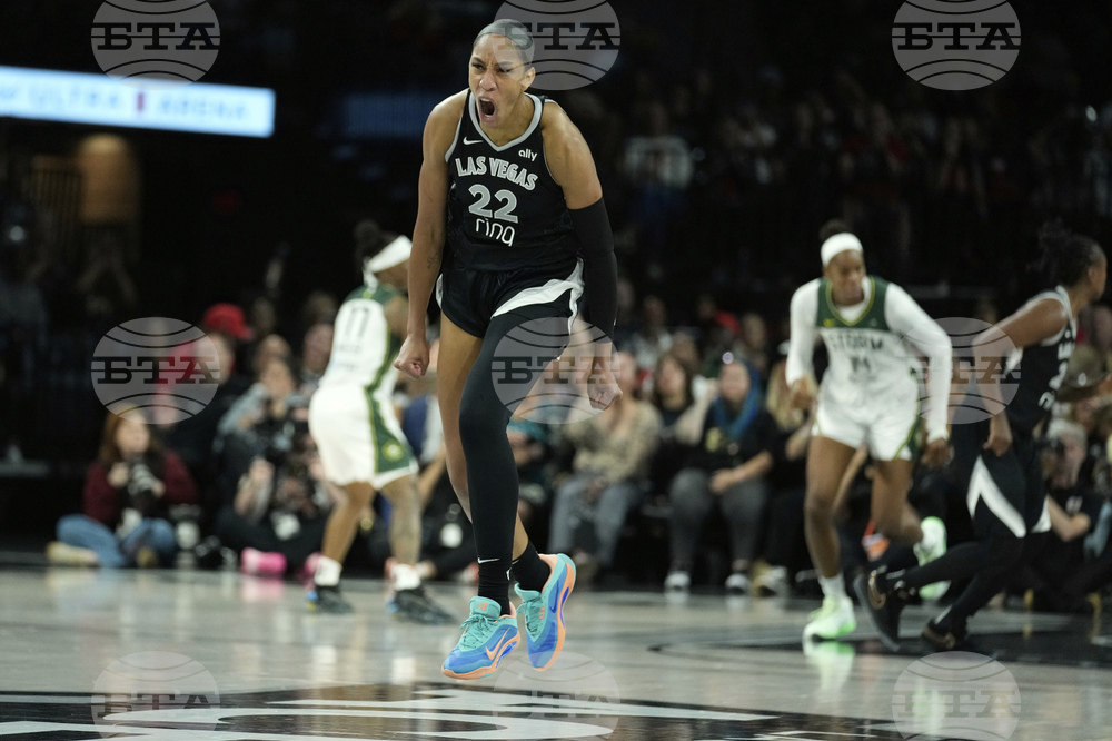Las Vegas Aces center A'ja Wilson (22) celebrates after a play against the Seattle Storm during the second half of Game 3 in the first round of the WNBA basketball playoffs Thursday, Sept. 18, 2025, in Las Vegas. (AP Photo/John Locher)