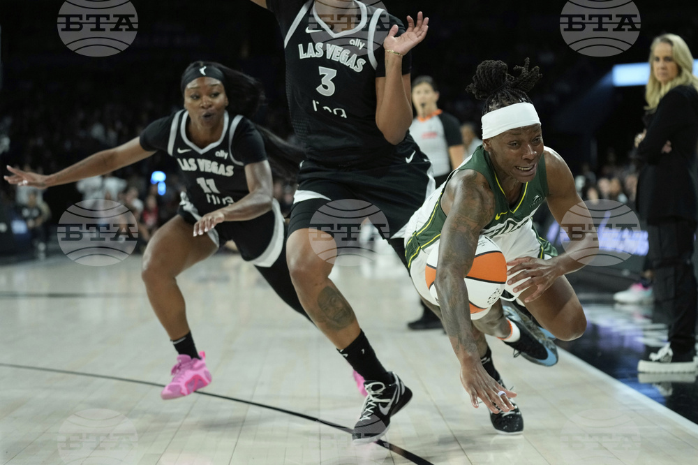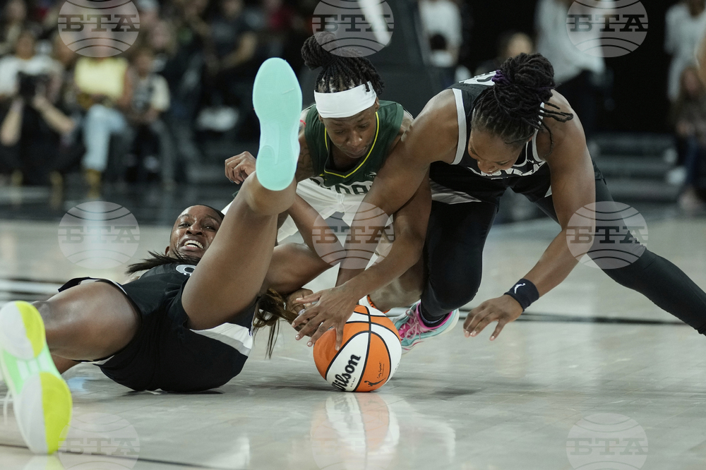 From left, Las Vegas Aces guard Jackie Young (0), Seattle Storm guard Erica Wheeler (17) and Las Vegas Aces guard Chelsea Gray (12) scramble for the ball during the first half of Game 3 in the first round of the WNBA basketball playoffs Thursday, Sept. 18, 2025, in Las Vegas. (AP Photo/John Locher)