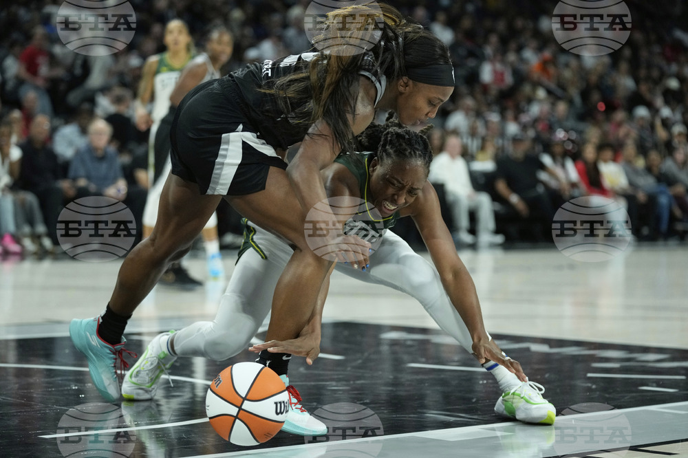 Las Vegas Aces guard Jackie Young, right, and Seattle Storm forward Nneka Ogwumike (3) scramble for the ball during the first half of Game 3 in the first round of the WNBA basketball playoffs Thursday, Sept. 18, 2025, in Las Vegas. (AP Photo/John Locher)