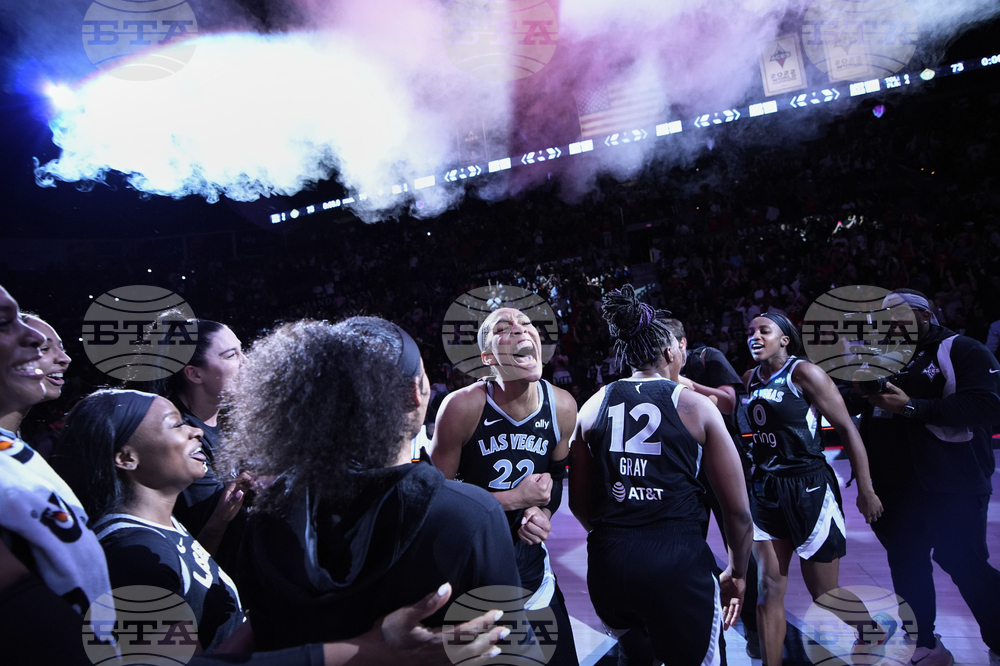 Las Vegas Aces center A'ja Wilson (22) celebrates with teammates after defeating the Seattle Storm in Game 3 in the first round of the WNBA basketball playoffs Thursday, Sept. 18, 2025, in Las Vegas. (AP Photo/John Locher)