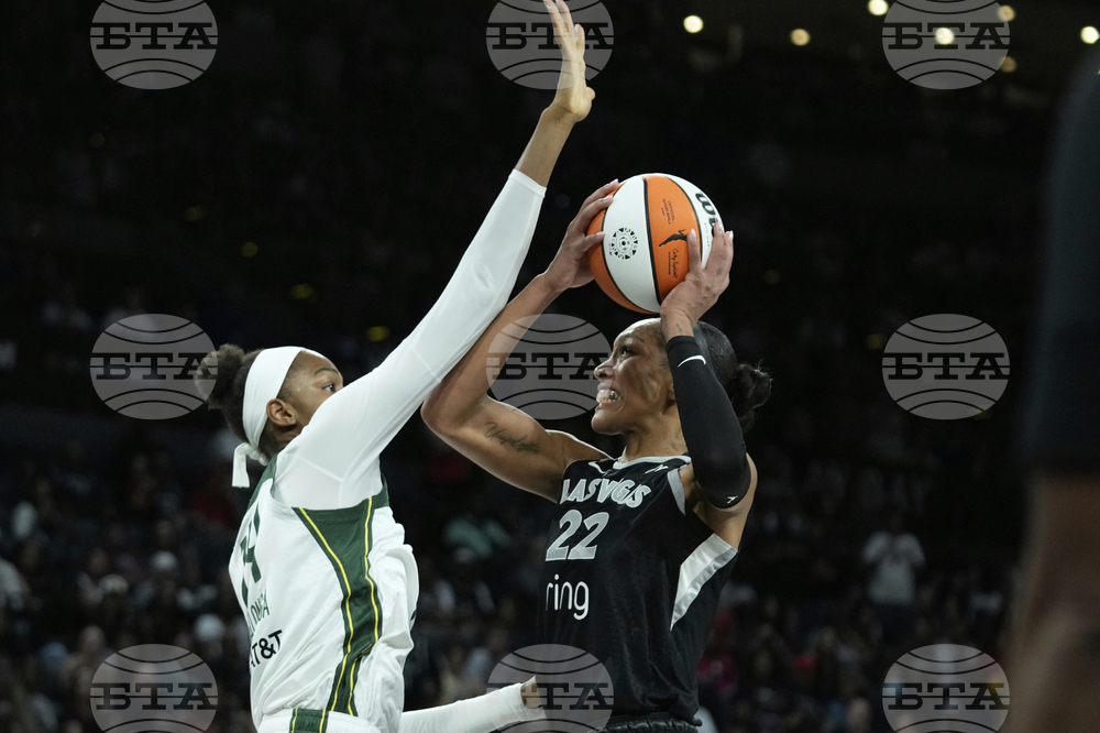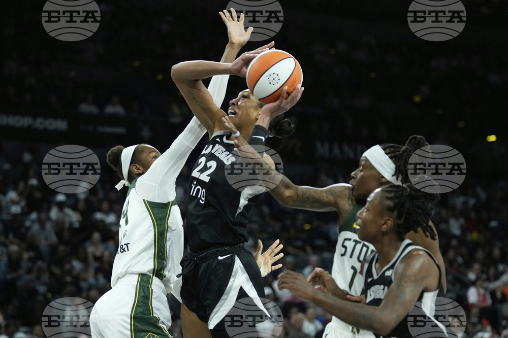 Las Vegas Aces center A'ja Wilson (22) shoots over Seattle Storm center Dominique Malonga (14) during the second half of Game 3 in the first round of the WNBA basketball playoffs Thursday, Sept. 18, 2025, in Las Vegas. (AP Photo/John Locher)