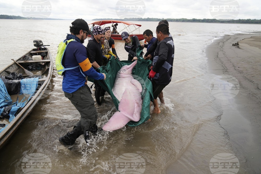 Scientists and veterinarians capture a pink river dolphin in the Amazon River for health checks in Puerto Narino, Colombia, Sunday, Sept. 7, 2025. (AP Photo/Fernando Vergara)
