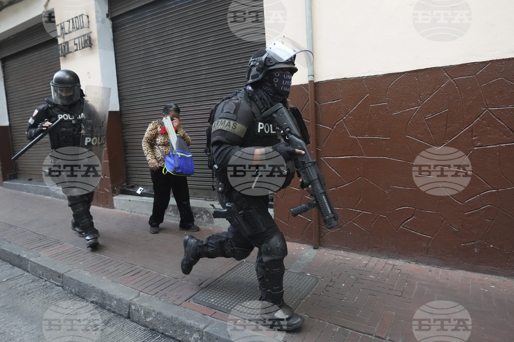 Police officers run during protests, after President Daniel Noboa eliminated the diesel subsidy in Quito, Ecuador, Tuesday, Sept. 16, 2025. (AP Photo/Dolores Ochoa)