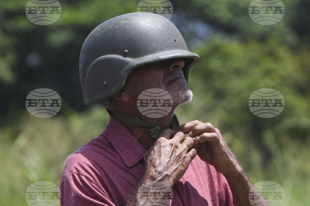A member of the government-organized militias adjusts his helmet during military training at Fort Paramacay in Valencia, Venezuela, Saturday, Sept. 13, 2025. (AP Photo/Jacinto Oliveros)