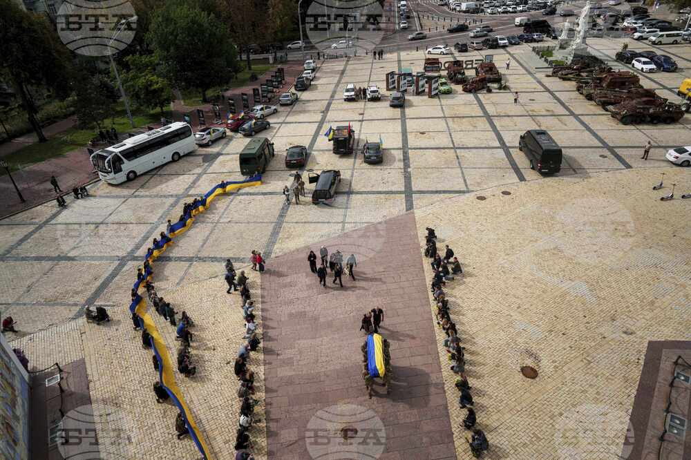 People kneel down, as honor guards carry the coffin of Artem Antonenko, a Ukrainian serviceman, during his funeral ceremony in the center of Kyiv, Ukraine, Friday, Sept. 19, 2025. (AP Photo/Evgeniy Maloletka)