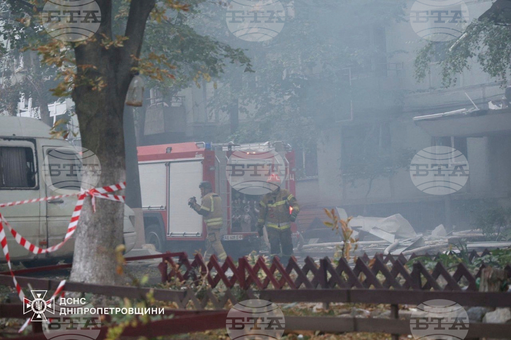 In this photo provided by the Ukrainian Emergency Services on Saturday, Sept. 20, 2025, rescuers work on a site of a residential house damaged by a Russian strike on Dnipro, Ukraine. (Ukrainian Emergency Service via AP)