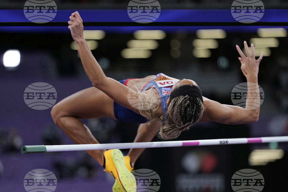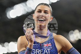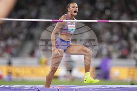 Britain's Katarina Johnson-Thompson fails an attempt in the heptathlon high jump at the World Athletics Championships in Tokyo, Friday, Sept. 19, 2025. (AP Photo/Matthias Schrader)