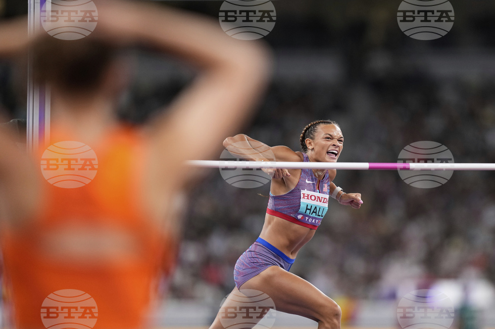 United States' Anna Hall competes in the women's heptathlon high jump at the World Athletics Championships in Tokyo, Friday, Sept. 19, 2025. (AP Photo/Eugene Hoshiko)