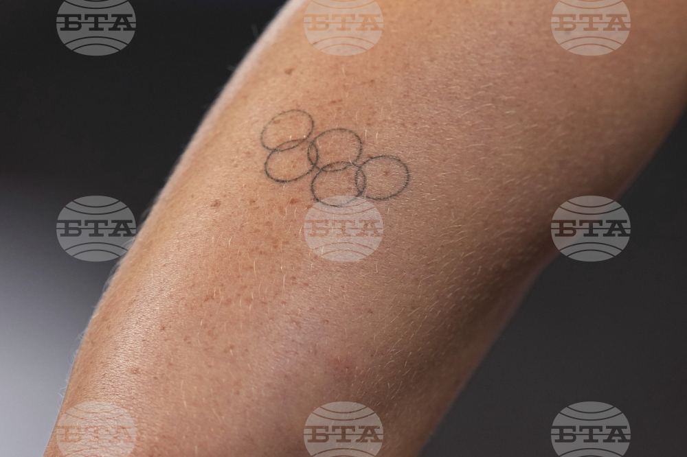 A tattoo of the Olympic rings is seen on the arm of Ireland's Kate O'Connor as she waits to attempt in the women's heptathlon high jump at the World Athletics Championships in Tokyo, Friday, Sept. 19, 2025. (AP Photo/Eugene Hoshiko)
