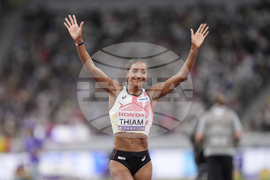 Belgium's Nafissatou Thiam reacts after making an attempt in the women's heptathlon high jump at the World Athletics Championships in Tokyo, Friday, Sept. 19, 2025. (AP Photo/Eugene Hoshiko)