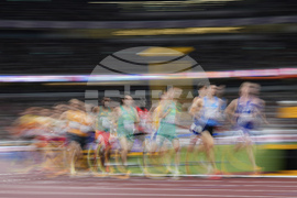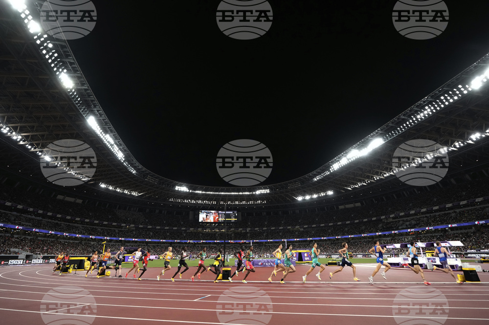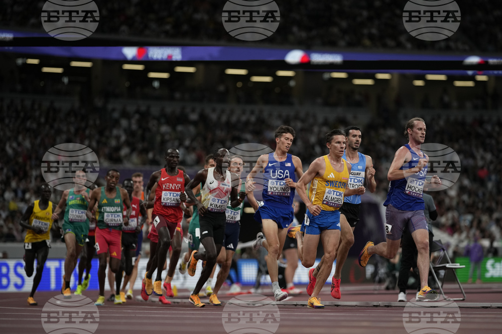 Athletes compete in men's 5,000 meters heat at the World Athletics Championships in Tokyo, Friday, Sept. 19, 2025. (AP Photo/Eugene Hoshiko)