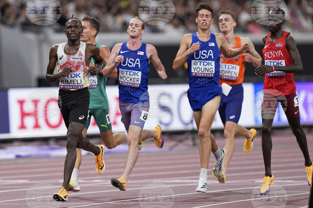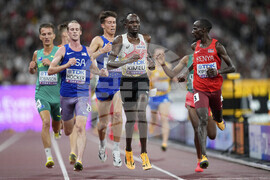 Kenya's Mathew Kipchumba Kipsang, Belgium's Isaac Kimeli, United States' Cole Hocker and Australia's Ky Robinson cross the line to finish a men's 5,000 meters heat at the World Athletics Championships in Tokyo, Friday, Sept. 19, 2025. (AP Photo/Petr David Josek)