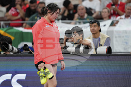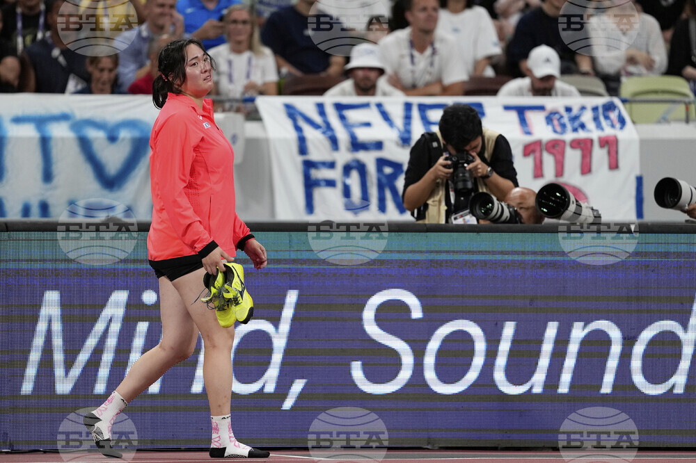 Japan's Haruka Kitaguchi carries her shoes after her last attempt in the women's javelin throw qualification at the World Athletics Championships in Tokyo, Friday, Sept. 19, 2025. (AP Photo/Matthias Schrader)