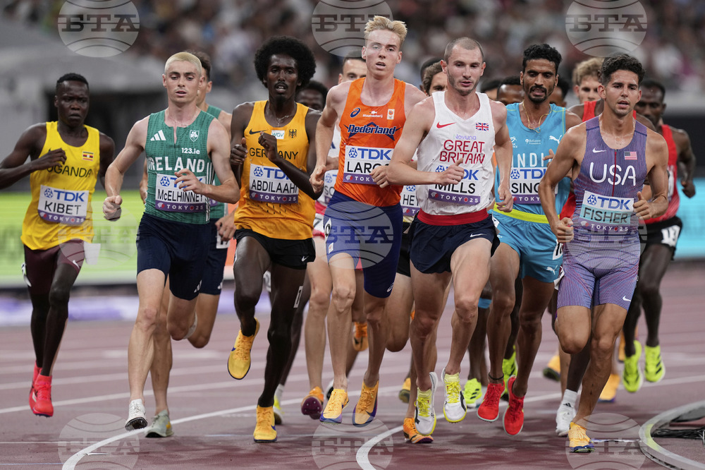 United States' Grant Fisher, Ethiopia's Biniam Mehary, Bahrain's Birhanu Balew, Britain's George Mills and France's Jimmy Gressier race in a men's 5,000 meters heat at the World Athletics Championships in Tokyo, Friday, Sept. 19, 2025. (AP Photo/Petr David Josek)