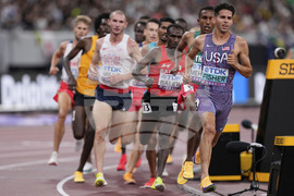 United States' Cole Hocker races ahead of others to compete in men's 5,000 meters heat at the World Athletics Championships in Tokyo, Friday, Sept. 19, 2025. (AP Photo/Eugene Hoshiko)