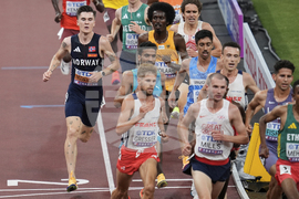 Norway's Jakob Ingebrigtsen races behind Netherlands' Niels Laros to compete in men's 5,000 meters heat at the World Athletics Championships in Tokyo, Friday, Sept. 19, 2025. (AP Photo/Eugene Hoshiko)