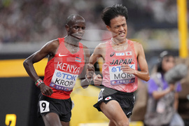 Japan's Nagiya Mori races ahead of Kenya's Jacob Krop to compete in men's 5,000 meters heat at the World Athletics Championships in Tokyo, Friday, Sept. 19, 2025. (AP Photo/Eugene Hoshiko)