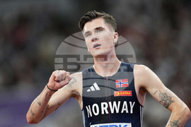Norway's Jakob Ingebrigtsen reacts after competing in men's 5,000 meters heat at the World Athletics Championships in Tokyo, Friday, Sept. 19, 2025. (AP Photo/Eugene Hoshiko)