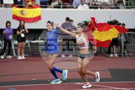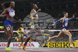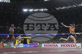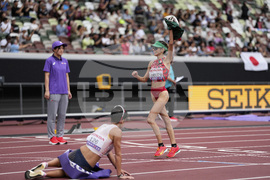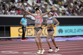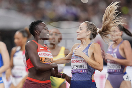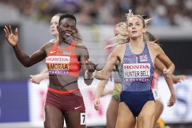 Kenya's Mary Moraa crosses the finish line before Britain's Georgia Hunter Bell in a women's 800 meters semifinal at the World Athletics Championships in Tokyo, Friday, Sept. 19, 2025. (AP Photo/Abbie Parr)