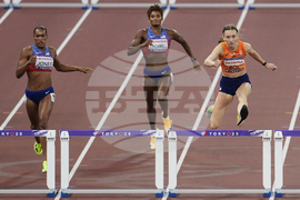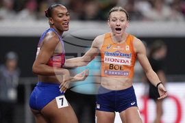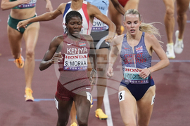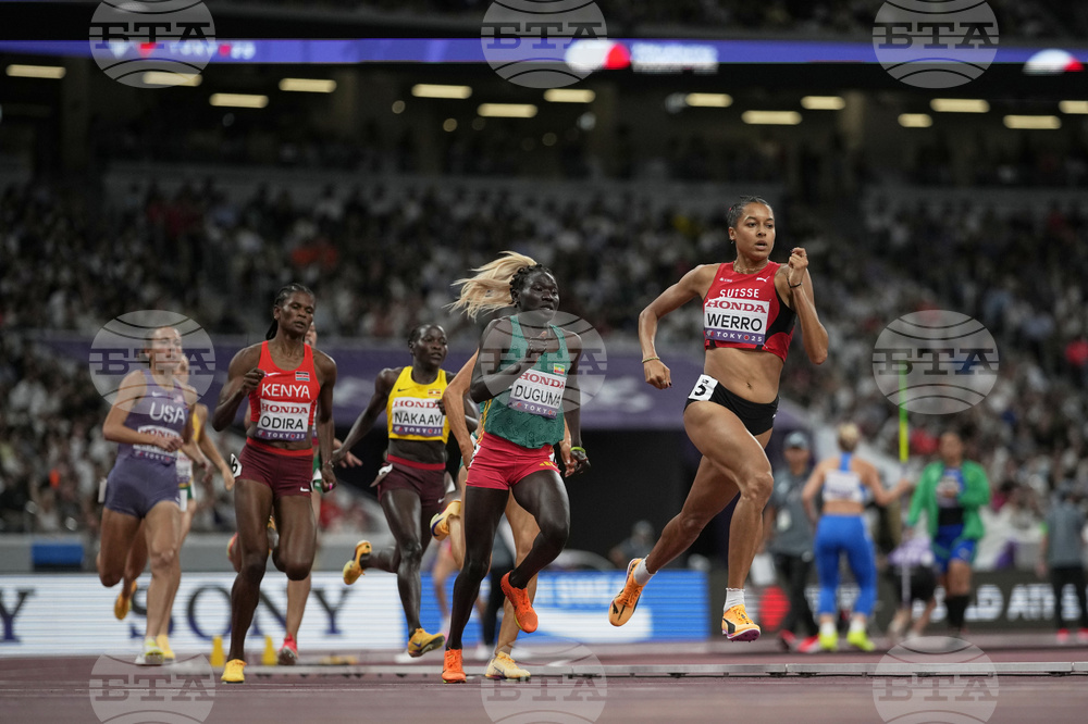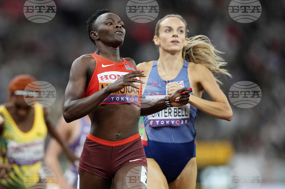 Kenya's Mary Moraa leads Britain's Georgia Hunter Bell to win a women's 800 meters semifinal at the World Athletics Championships in Tokyo, Friday, Sept. 19, 2025. (AP Photo/Petr David Josek)