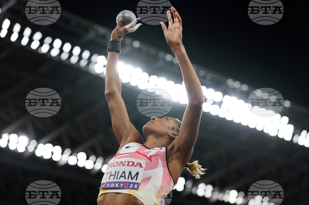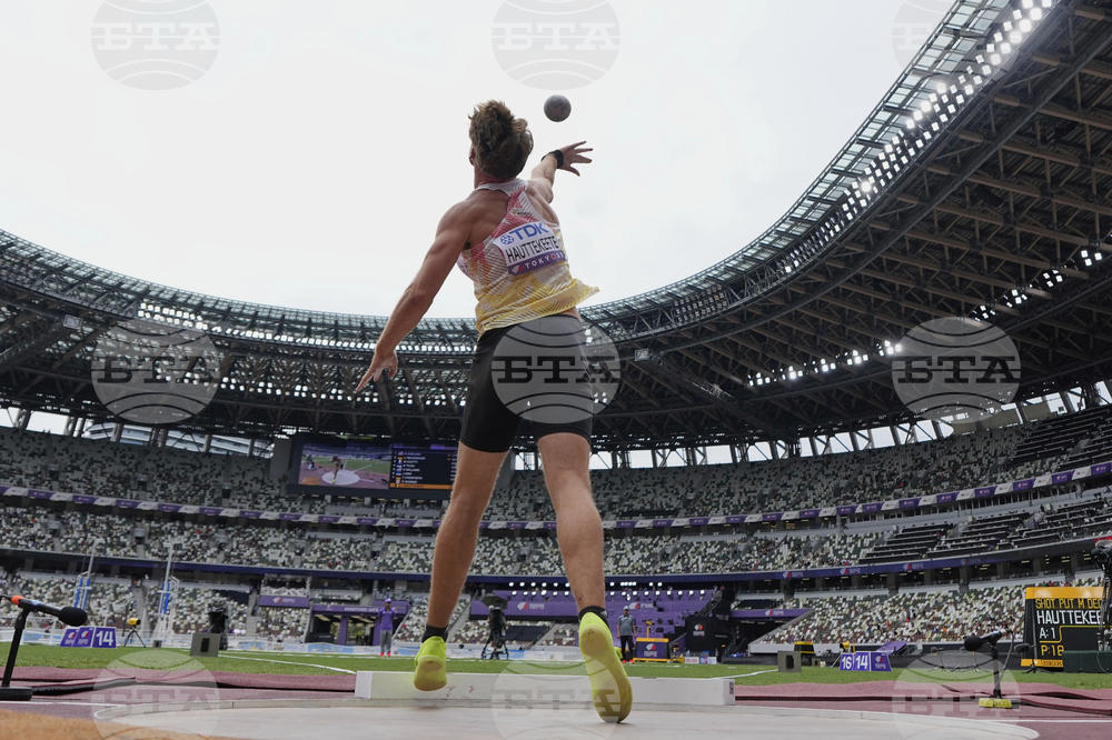 Belgium's Jente Hauttekeete competes in the decathlon shot put at the World Athletics Championships in Tokyo, Saturday, Sept. 20, 2025. (AP Photo/Ashley Landis)