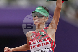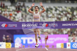 Ecuador's David Hurtado gestures when crossing the finish line in the men's 20 kilometers race walk at the World Athletics Championships in Tokyo, Saturday, Sept. 20, 2025. (AP Photo/Matthias Schrader)