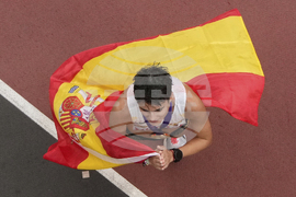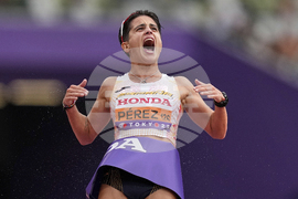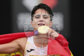 Spain's Paul McGrath reacts after taking the bronze medal in the men's 20 kilometers race walk at the World Athletics Championships in Tokyo, Saturday, Sept. 20, 2025. (AP Photo/Abbie Parr)