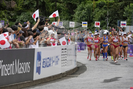 Japan's Haruka Kitaguchi takes a drink in the women's javelin throw qualification at the World Athletics Championships in Tokyo, Friday, Sept. 19, 2025. (AP Photo/Ashley Landis)