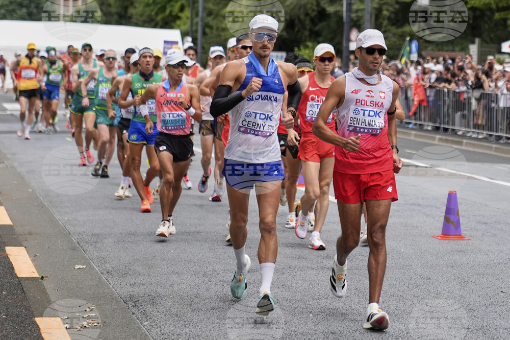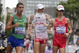 Brazil's Caio Bonfim races alongside China's Wang Zhaozhao and France's Aurelien Quinion on his way to winning the gold medal in the men's 20 kilometers race walk at the World Athletics Championships in Tokyo, Saturday, Sept. 20, 2025. (AP Photo/Abbie Parr)