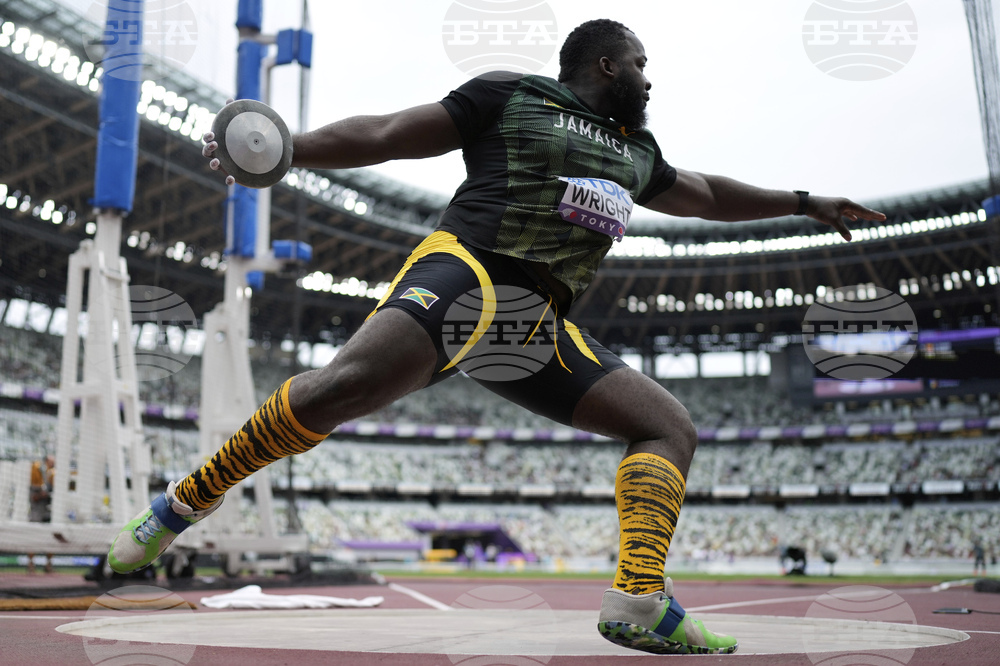 Jamaica's Fedrick Dacres prepares for an attempt in the men's discus throw qualification at the World Athletics Championships in Tokyo, Saturday, Sept. 20, 2025. (AP Photo/Matthias Schrader)