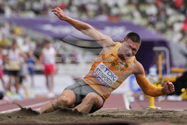 Netherlands' Ruben Rolvink competes during the men's discus throw qualification at the World Athletics Championships in Tokyo, Saturday, Sept. 20, 2025. (AP Photo/Bernat Armangue)
