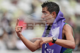 Brazil's Caio Bonfim reacts after winning the men's 20 kilometers race walk at the World Athletics Championships in Tokyo, Saturday, Sept. 20, 2025. (AP Photo/Ashley Landis)