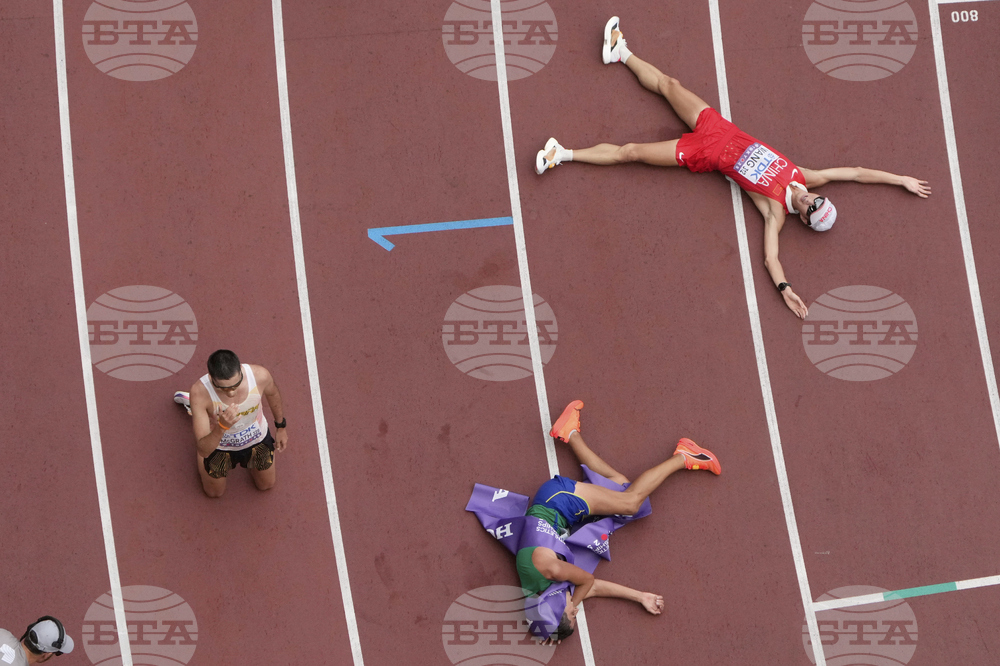 The winners of the men's 20 kilometers race walk, gold medalist Brazil's Caio Bonfim, bottom, silver medalist China's Wang Zhaozhao, right, and bronze medalist Spain's Paul McGrath react after crossing the finish line at the World Athletics Championships in Tokyo, Saturday, Sept. 20, 2025. (AP Photo/David J. Phillip)