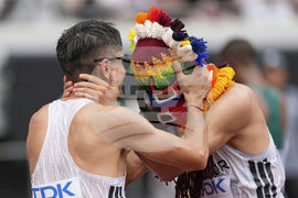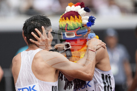 France's Aurelien Quinion, left, congratulates Brazil's Caio Bonfim after winning the men's 20 kilometers race walk at the World Athletics Championships in Tokyo, Saturday, Sept. 20, 2025. (AP Photo/Ashley Landis)