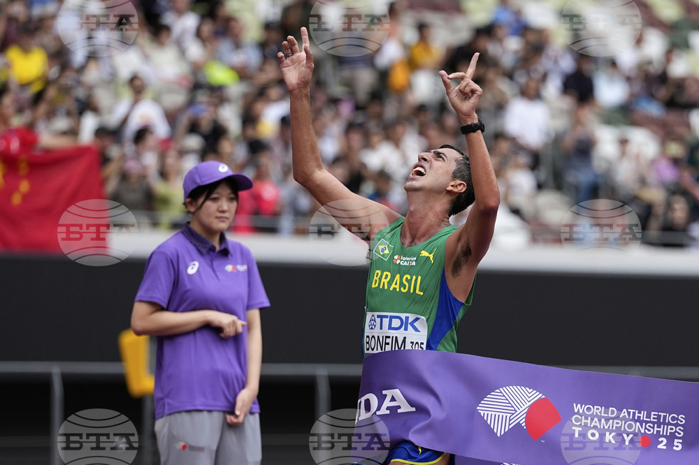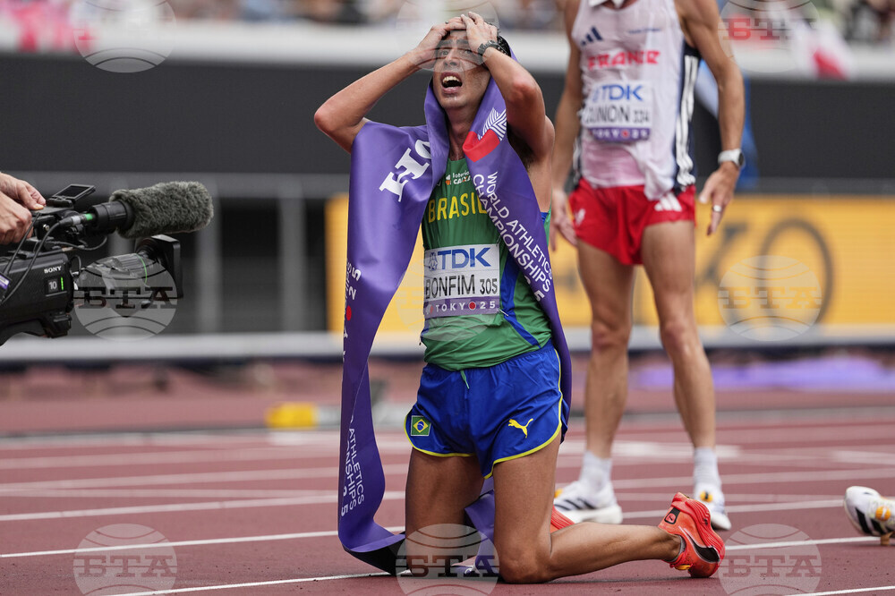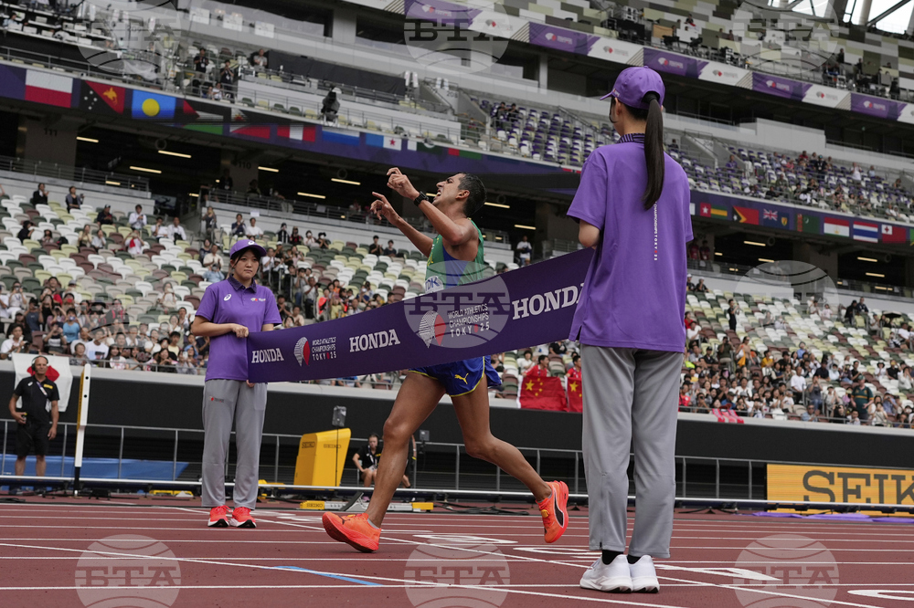 Brazil's Caio Bonfim wins the men's 20 kilometers race walk gold medal at the World Athletics Championships in Tokyo, Saturday, Sept. 20, 2025. (AP Photo/Bernat Armangue)
