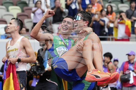 Brazil's Caio Bonfim is carried by Brazil's Matheus Correa after winning the the men's 20 kilometers race walk at the World Athletics Championships in Tokyo, Saturday, Sept. 20, 2025. (AP Photo/David J. Phillip)
