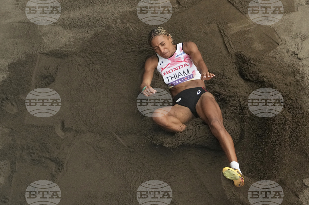 Belgium's Nafissatou Thiam competes in the heptathlon long jump at the World Athletics Championships in Tokyo, Saturday, Sept. 20, 2025. (AP Photo/David J. Phillip)