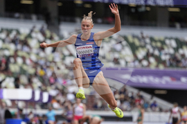 Finland's Saga Vanninen competes in the heptathlon long jump at the World Athletics Championships in Tokyo, Saturday, Sept. 20, 2025. (AP Photo/Ashley Landis)
