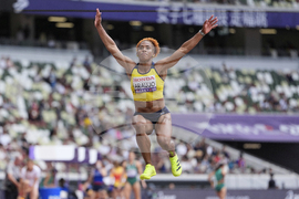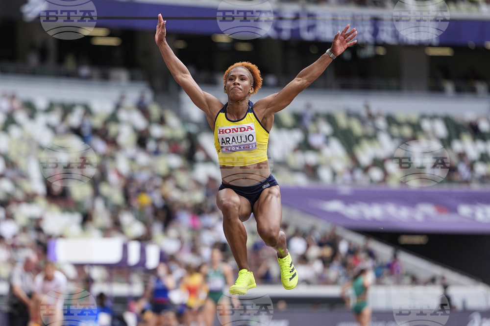 Colombia's Martha Araujo competes in the decathlon long jump at the World Athletics Championships in Tokyo, Saturday, Sept. 20, 2025. (AP Photo/Ashley Landis)