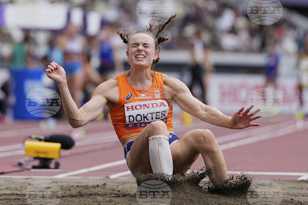 Netherlands' Sofie Dokter competes in the heptathlon long jump at the World Athletics Championships in Tokyo, Saturday, Sept. 20, 2025. (AP Photo/Ashley Landis)