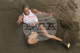 Italy's Sveva Gerevini makes an attempt in the heptathlon long jump at the World Athletics Championships in Tokyo, Saturday, Sept. 20, 2025. (AP Photo/Matthias Schrader)