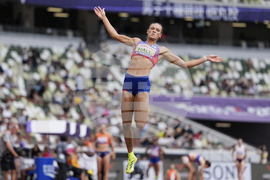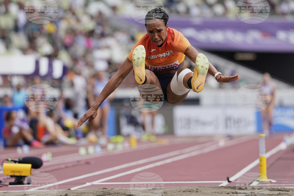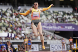Spain's Maria Vicente competes in the heptathlon long jump at the World Athletics Championships in Tokyo, Saturday, Sept. 20, 2025. (AP Photo/Ashley Landis)
