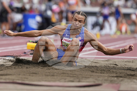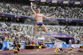Netherlands' Emma Oosterwegel makes an attempt in the heptathlon long jump at the World Athletics Championships in Tokyo, Saturday, Sept. 20, 2025. (AP Photo/Matthias Schrader)