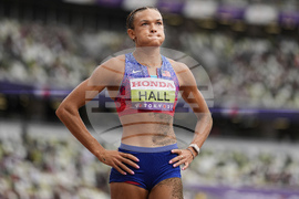 United States' Anna Hall reacts after missing her final attempt in the heptathlon high jump at the World Athletics Championships in Tokyo, Friday, Sept. 19, 2025. (AP Photo/David J. Phillip)