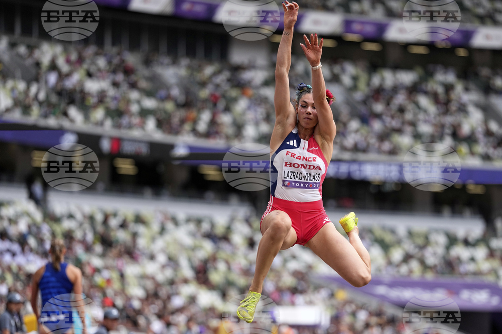 France's Auriana Lazraq-Khlass makes an attempt in the heptathlon long jump at the World Athletics Championships in Tokyo, Saturday, Sept. 20, 2025. (AP Photo/Matthias Schrader)