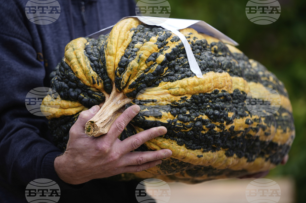 A man carries a giant pumpkin during a weigh-in competition prior to the exhibition of giant vegetables at The Moscow State University Apothecaries Garden in Moscow, Russia, Friday, Sept. 19, 2025. (AP Photo/Pavel Bednyakov)