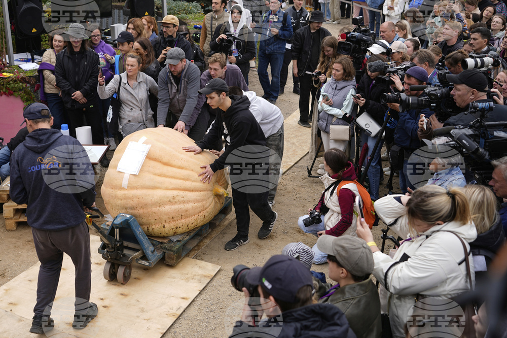 A national record-breaking pumpkin weighing 969 kg (2136 pounds) is displayed during a weigh-in competition prior to the exhibition of giant vegetables at The Moscow State University Apothecaries Garden in Moscow, Russia, Friday, Sept. 19, 2025. (AP Photo/Pavel Bednyakov)