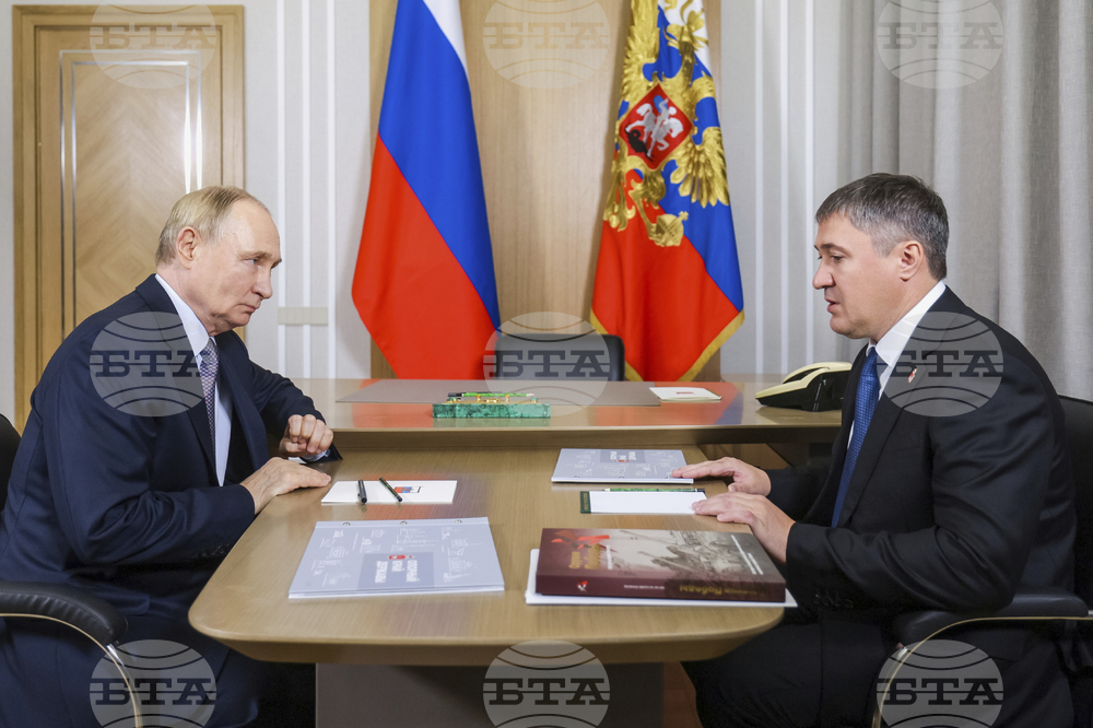 Russian President Vladimir Putin, left, speaks with the governor of Perm Territory Dmitri Makhonin during their meeting in Perm, Russia, Friday, Sept. 19, 2025. (Gavriil Grigorov, Sputnik, Kremlin Pool Photo via AP)