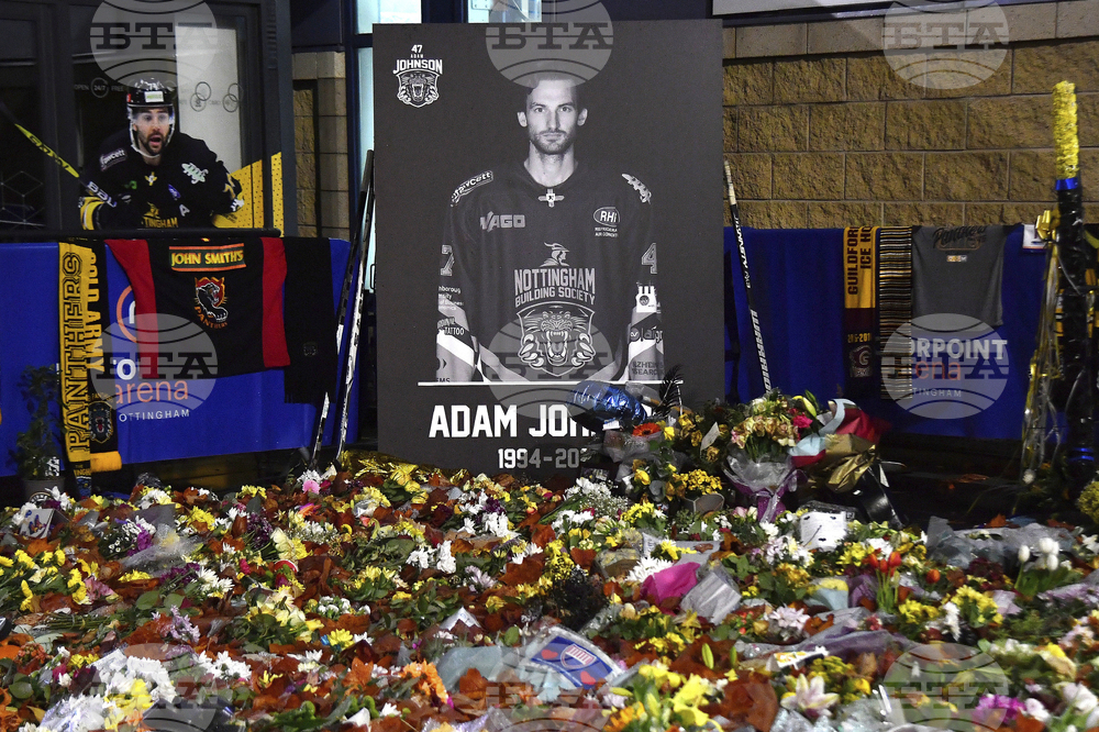 FILE - Floral tributes are placed for Nottingham Panthers player Adam Johnson, who died from a skate cut to the neck, outside the Motorpoint Arena, in Nottingham, England, on Nov. 18, 2023, before a memorial ice hockey game between the Panthers and the Manchester Storm. (AP Photo/Rui Vieira, File)