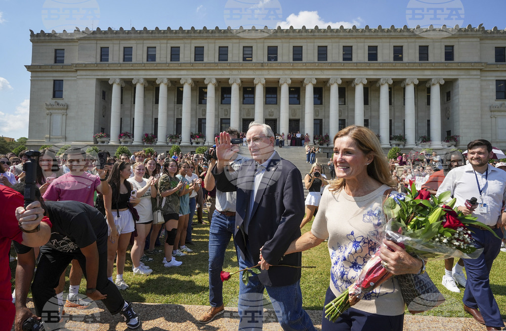 Texas A&M University President Mark Welsh, with his wife Betty, greets supporters as he exits the administration building after resigning in College Station, Texas, on Friday, Sept. 19, 2025. (Jay Janner/Austin American-Statesman via AP)